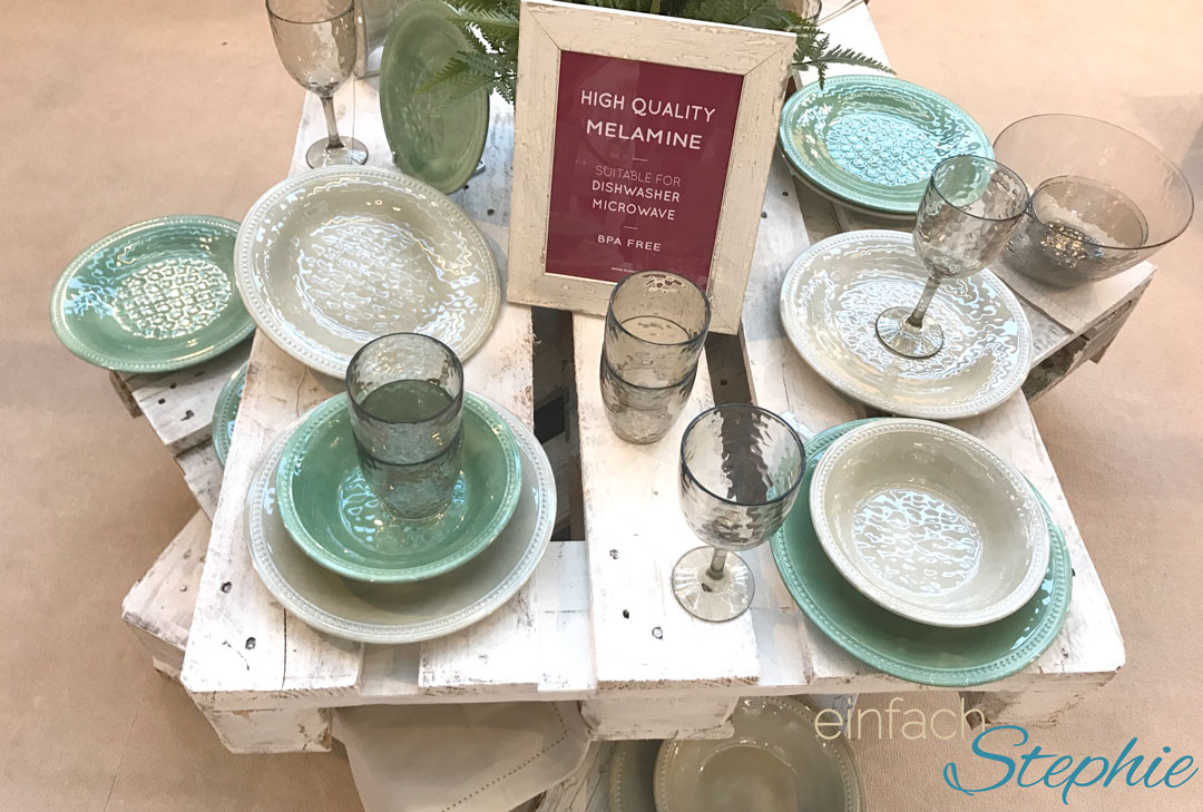 Oder auch das Campinggeschirr, das aussieht wie schönes Porzellan, aber aus Melanin gemacht ist. Selbst wenn wir mit den Augen ganz nah heran gehen, sehen wir keinen Unterschied. Erst, als ich einen Teller und ein “Glas” in die Hand nahm, erkannte ich das Material.