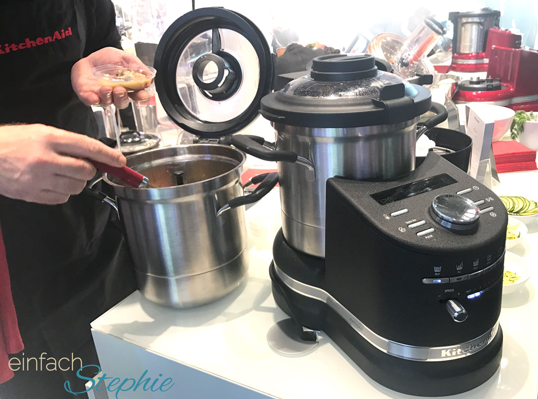 Zunächst wollten wir die großen Haushaltsgeräte Anbieter sehen, wie Kitchenaid & co. Auffällig war hier, wie viele Firmen inzwischen versuchen, den Thermomix nachzuahmen. Auch Kitchenaid bietet inzwischen eine Küchenmaschine zum Kochen an.
