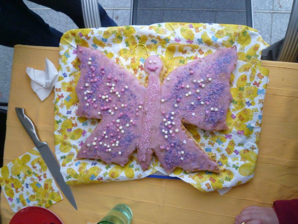 Ich selbst habe damals einen Blechkuchen gebacken (s.r.) und den Schmetterling dann mit Messer vorgezeichnet und ausgeschnitten – erst danach hatte ich diese viel einfachere Art des Backens eines Schmetterlingskuchens entdeckt..