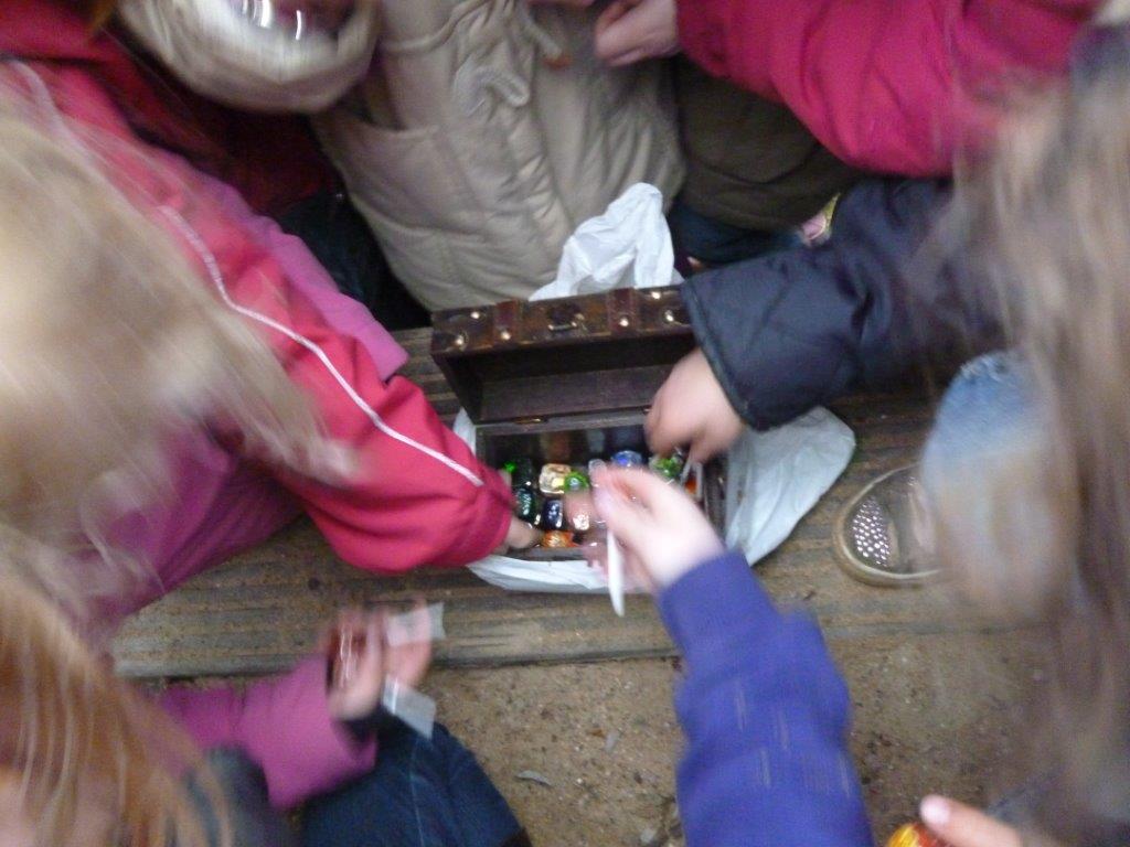 Die fertige Schatzkarte haben wir geknüllt und in 6 Teile gerissen. Jedes Stück wurde (vor Ankunft der Gäste) irgendwo im Garten versteckt. Die Kinder wussten also, dass sie 6 Teile finden müssen, um die Karte dann wie ein Puzzle zusammensetzen zu können. Sichtbar wurde nun der Gartenplan – da wurde gedreht und überlegt, wie muss man das denn jetzt halten? – mitten auf der Karte war ein dickes Kreuz eingezeichnet. In unserem Fall im Sandkasten, auf dem ein Spielhäuschen steht.