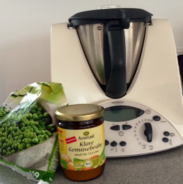 - Tiefkühlerbsen, Wasser und Gemüsebrühpulver hinzufügen und 15 Min / 100 Grad / Stufe 1 garen.